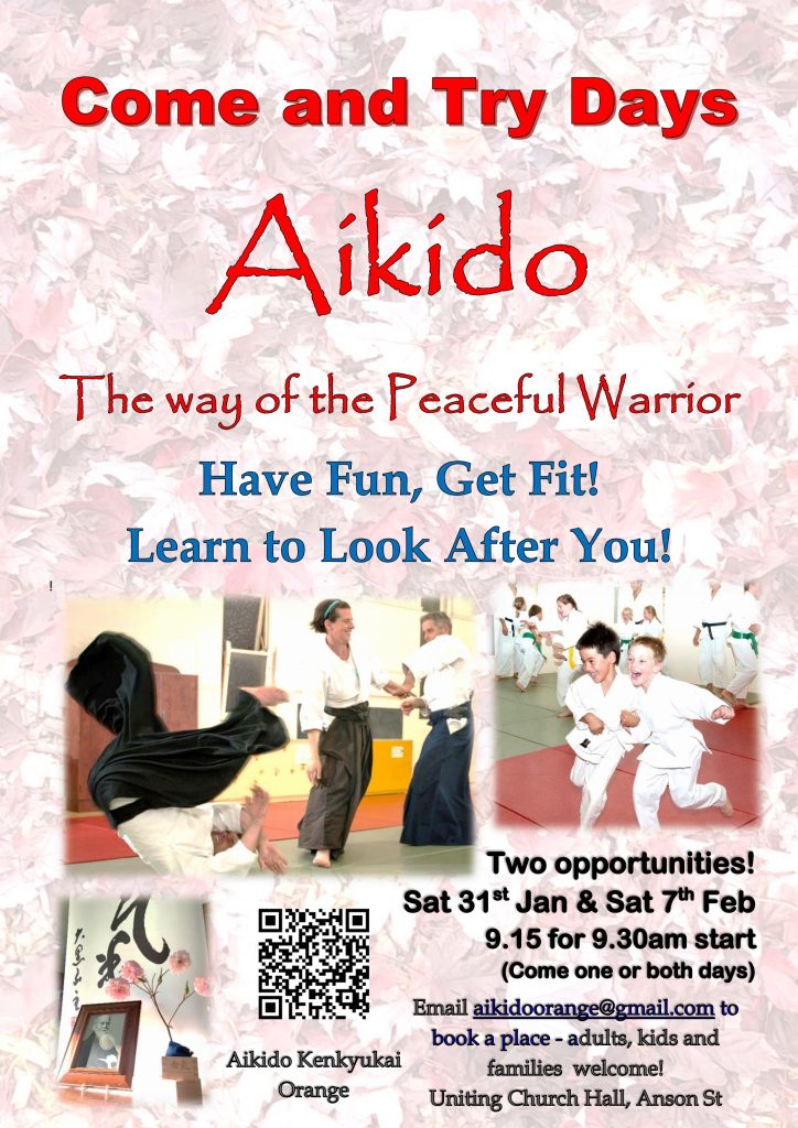 Training has re-commenced at Orange Dojo and we’re looking forward to another big year – our 24th year of operation! We’re holding two Come and Try Days on Saturday 31st January and the following Saturday (7th February) for anyone interested in joining us on the mat for the first time and experiencing this amazing martial art. Check out the poster for details and please help spread the word.