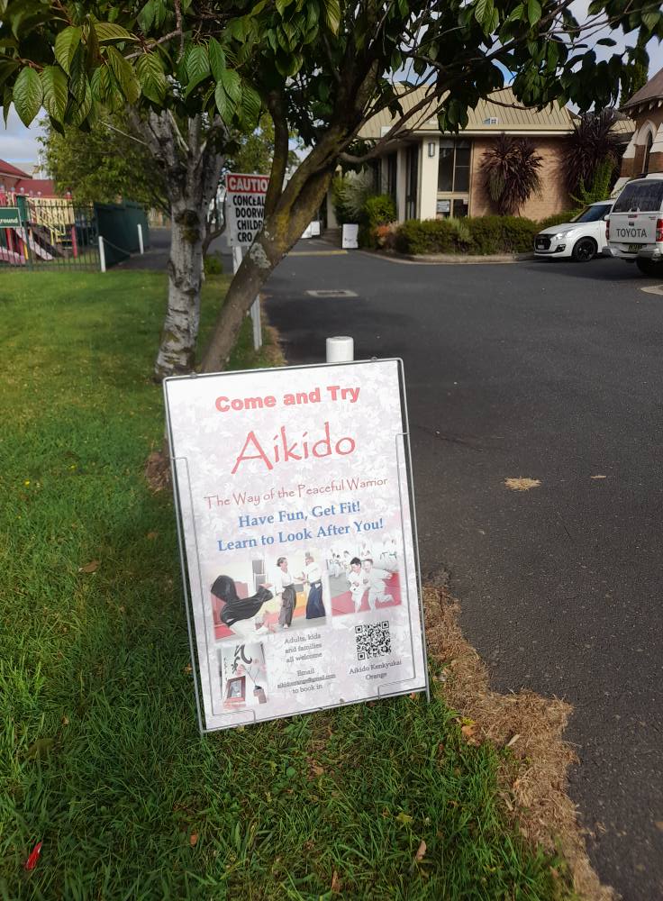 Orange Dojo classes are held at the Uniting Church Hall in Anson Street Orange, on Tuesdays and Thursdays, with special sessions on the first Saturday of each month. New students are invited to join at anytime, but are requested to email aikdioorange@gmail.com or call 6361 0129 prior to attending their first class.